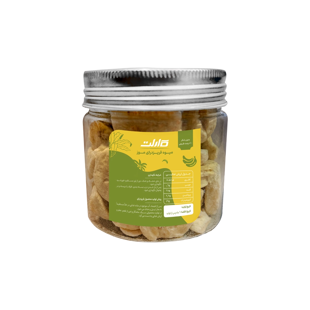 میوه موز فریزدرای ۱۰۰ درصد طبیعی بدون شکر ترد و پفکی فاقد افزودنی . این محصول با روش انجماد سریع تولید می شود که از چروکیده شدن و اکسید شدن آن جلوگیری کرده و تمام خواص یک موز را حفظ می کند.