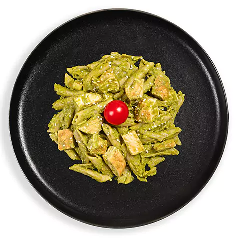 تهیه شده از پاستای رژیمی و پروتئینی برند زرماکارون،ترکیب شده با سس پستو رژیمی گارلت به همراه 100 گرم تکه های سینه مرغ گریل شده.